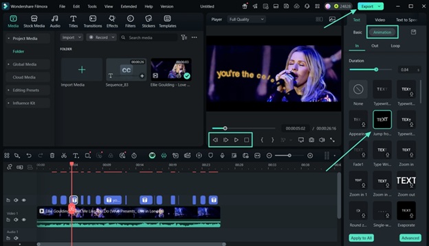 - Step 4. Apply Animations to the Lyrics and Export the Video. Then, hit the “Animation” panel and apply it to the text. Use the “Playback” icons to preview the video and hit the “Export” button.