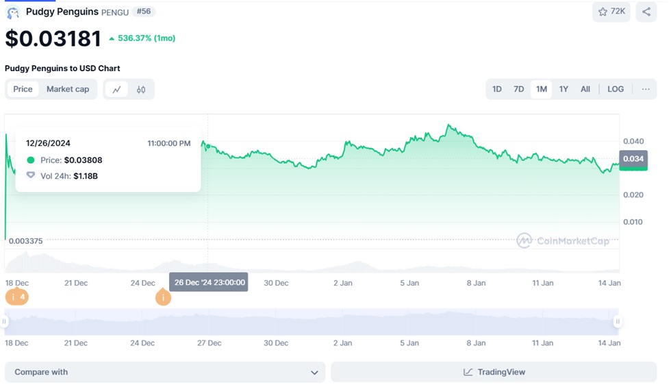 With a market capitalization of close to $2 billion, PENGU is currently trading around the $0.03 level.