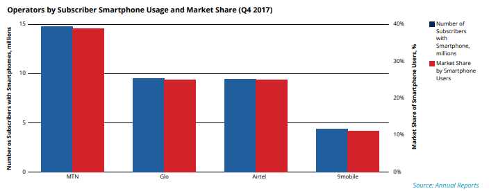 Of those subscribing to the four major operators, just 38 million are smartphone users, with MTN accounting for more than one third of the total. Airtel and Glo have almost equal number of subscribers falling into this segment.