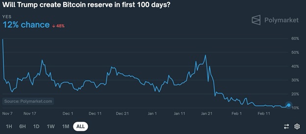 From US tariffs to the overall bearish market sentiment, Bitcoin has had its run of issues as of late. And things aren’t getting any better soon as Polymarket has recently shown that the odds of Donald Trump creating a Bitcoin reserve within the first 100 days have dropped to 12%.