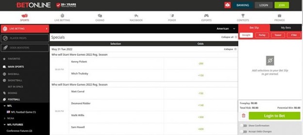 BetOnline provides an intuitive and user-friendly app, making in-play betting on the NFL simple. The odds are highly competitive, with hundreds of betting lines and props available for both teams and players.