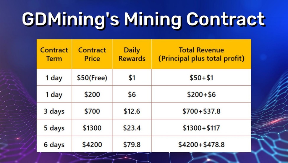 GDMining offers a variety of contracts to meet different investment needs. Some of the popular options include.
