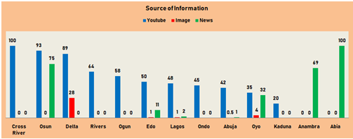 Analysis reveals that their reactions in terms of supporting or against the show increased public interest of not using YouTube, Image and News as dominant sources of understanding the show as it unfolds every day (of the period studied). The people in Cross River, Osun, Delta, Rivers, Ogun, Edo, Lagos, Ondo, Kaduna, Abia, Anambra and Bayelsa states including Abuja used the sources the most. They preferred using YouTube and Image more than the News. The more they used YouTube, the less they appropriated the News as a source. This also applies to Image usage. The more they employed YouTube, the less they used Image as the source.