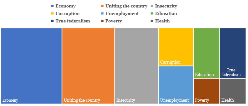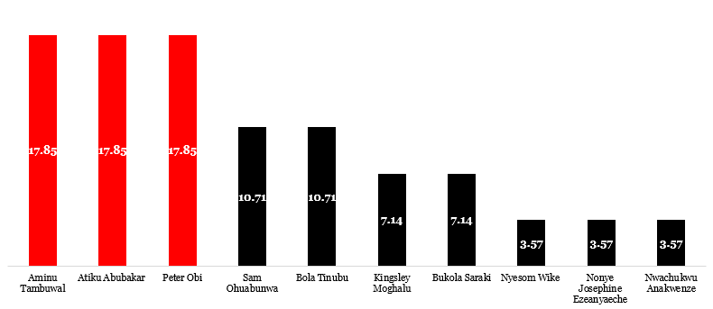 In terms of adopting the same past campaign pledges in their EOIs, Governor Aminu Tambuwal of Sokoto State, former Vice President Atiku Abubakar, and former governor Peter Obi of Anambra State stood out. Former President of the Pharmaceutical Society of Nigeria, PSN, Sam Ohuabunwa and the All Progressives Congress leader, Senator Bola Ahmed Tinubu followed the trio (see Exhibit 1). Our analysis also revealed that the aspirants thought Nigeria had become more divided in recent years. As a result, a leader who can unite all the regions is required. This was more Aminu Tambuwal’s, Bola Tinubu’s, Atiku Abubakar’s, Bukola Saraki’s, Peter Obi’s, and Nwachukwu Anakwenze’s position.