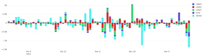 Tether swapped $3b in Tron Tether for ERC20 Tether, which accounts for the net ERC20 USDT inflow; Most outflows are stables. Weird that (apparently) no USDC/SHIB/LINK has left wallets. Net stable outflows ~$4b.