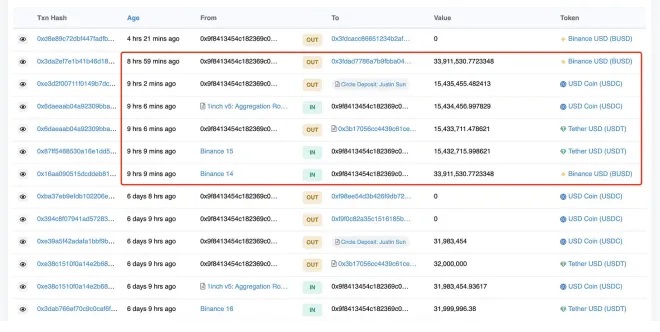 Justin Sun, withdrew 33,911,530 $BUSD and 15,432,715 $USDT from Binance 9 hours ago. Then he transferred 33,911,530 $BUSD to Paxos Treasury and exchanged 15,432,715 $USDT for 15,435,455 $USDC and transferred to Circle.