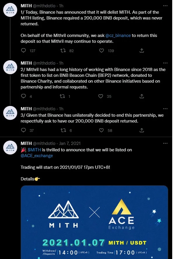 1/ Today, Binance has announced that it will delist MITH. As part of the MITH listing, Binance required a 200,000 BNB deposit, which was never returned.