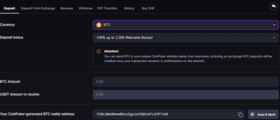 Login to your account by entering your email address and password. Click/tap on the wallet icon and choose “Deposit”. Select Bitcoin from the drop-down list. Enter the deposit amount and use your CoinPoker-generated wallet address to complete the payment.
