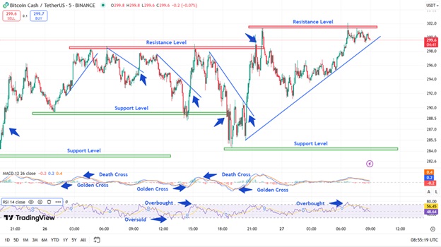 Is it the perfect time to invest in BCH? As illustrated in Chart 1, on February 27, the BCH trading day started with an ascending channel and eyeing to break the $301 key resistance. Could it trigger a bullish trend? In the preceding day, BCH began a brief fall, entered the phase of trading range, and kept fluctuating. At 18:25 UTC, BCH broke the support at $289 and dropped to $284. A Death Cross on MACD at 16:05 confirmed this downtime. At 18:55, BCH found support, experienced an uptrend, broke the resistance at $298, and reached $301. But at 22:05, BCHs price fell and closed at $294.3.