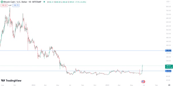 Considering the Bitcoin Cash price chart above, it is likely that in the near term, we will see a retest of the $135 level. However, we expect the price to bounce due to the newfound institutional interest, potentially reaching the key level of $345.