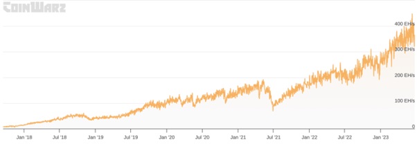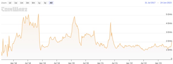 As seen on the Bitcoin Cash chart below, the hash rate has remained below 5 EH/s since 2017.