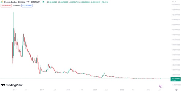Nevertheless, the price of Bitcoin Cash has been unable to keep up with Bitcoin since its inception. The chart below shows the Bitcoin Cash price against the Bitcoin price since 2017.