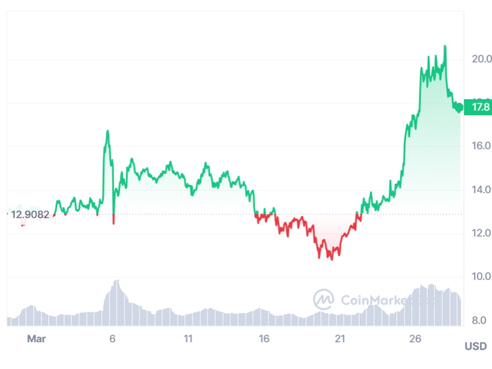 Currently the $ICP token is trading at $19.4 following over 10% dip today but 44% up in the weekly time frame. Despite this positive momentum, the current value is still 98% below its all-time high of $750.73 set three years ago. Investor predictions suggest a potential rise above $60 by the end of April, driven by the bullish market sentiment and ongoing developments within the $ICP network.