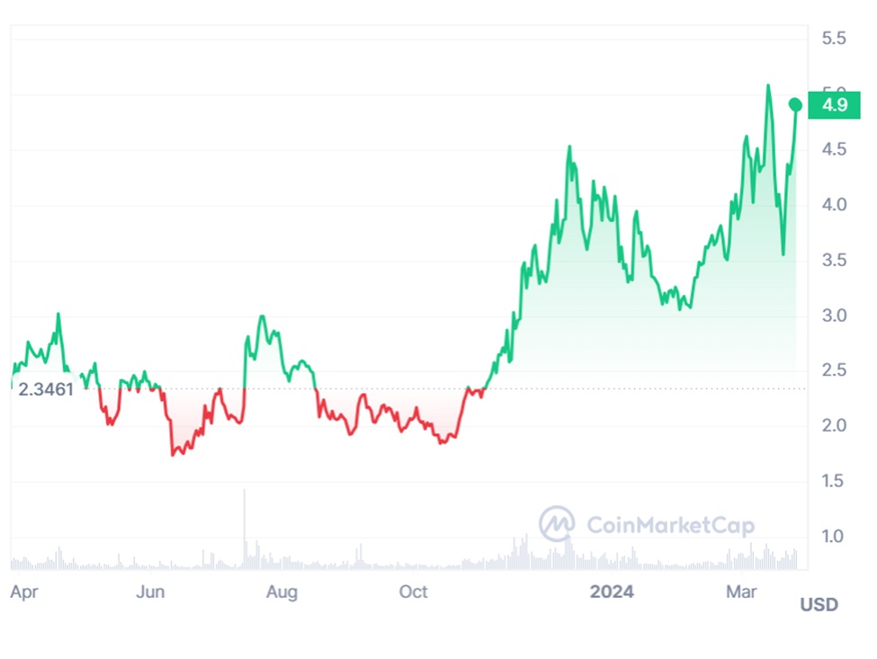 In the last 24 hours, Synthetix (SNX) experienced a slight 2% drop in price, reaching $4.9, with a trading volume of $102 million. However, it is up by 30% in the monthly time frame. It’s performing well above its 200-day simple moving average, indicating a bullish sentiment among investors. Analysts point to a strong support level at $4, with potential growth towards a $10 target. The market’s Fear & Greed Index stands at 81, suggesting a high level of investor greed.