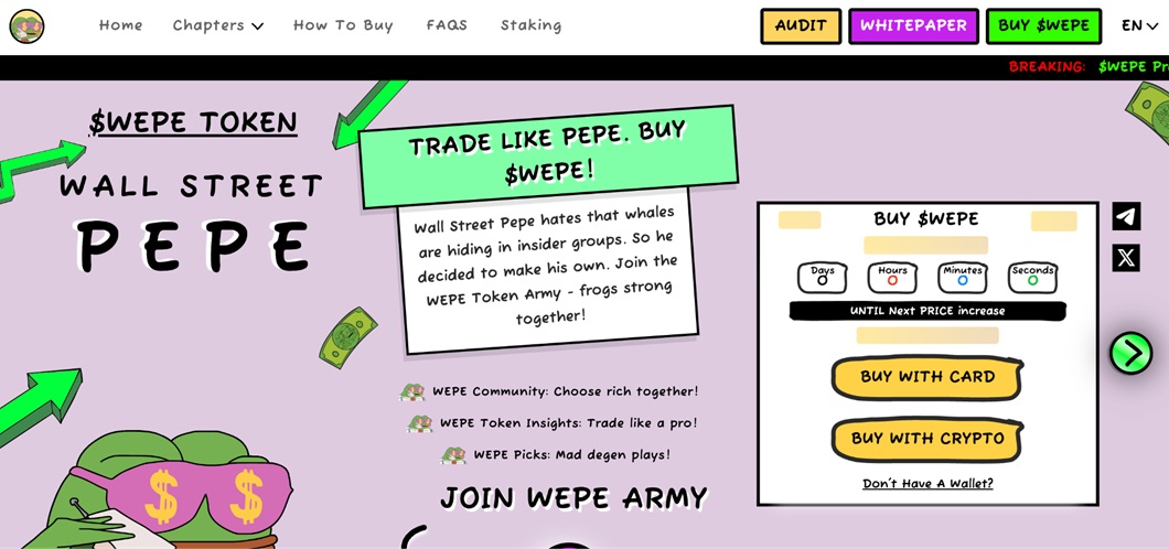 Wall Street Pepe ($WEPE) is a trending new meme coin capitalizing on the Pepe brand.