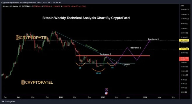 BTC is facing resistance at $23.5k-$24.5k, Inverted Head and Shoulder pattern forming on weekly chart.