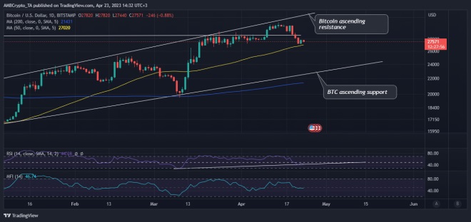 Bitcoin’s $27,557 press time price hovered above its 50-day moving average which may act as a psychological buy zone. But is a strong bounce-back possible at this point? Yes, but so is the possibility of an extended downside.