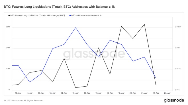 Whales were trimming their balances since mid-April according to the addresses with balances equal to and greater than 1000 BTC.