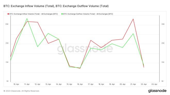 BTC exchange inflows have dominated compared to outflows since mid-month. Exchange outflows also increased, likely due to investors buying the dip. The rate of flow for both has been slowing down in the last two days.