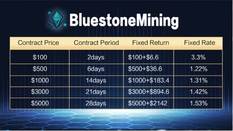 Currently, bluestonemining also offers various mining contract options, such as $100, $500, and $1,000 packages. Each has a unique ROI and specific contract period.