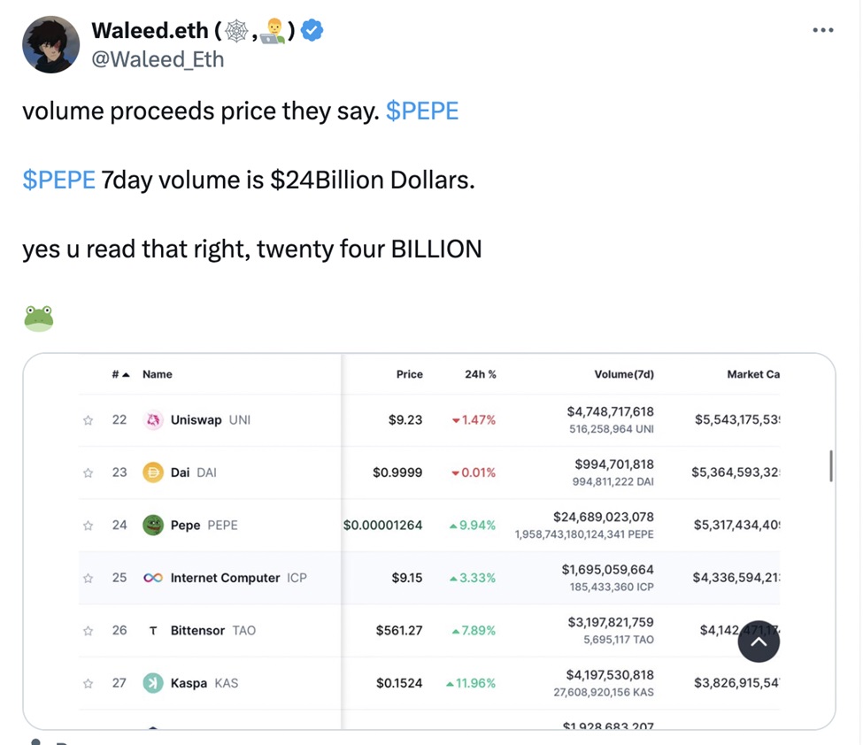 Pepe and Bonk are two of the most popular meme coins in the market. With a $5.4 billion market cap, Pepe is the third largest in the sector after Dogecoin and Shiba Inu. It’s also among the most traded and constantly beats SHIB on this metric, only trailing Dogecoin.