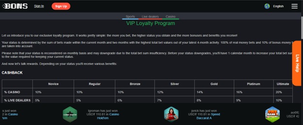 Customers will surely be impressed by the level of care and attention that Bons Casino puts into its VIP program.