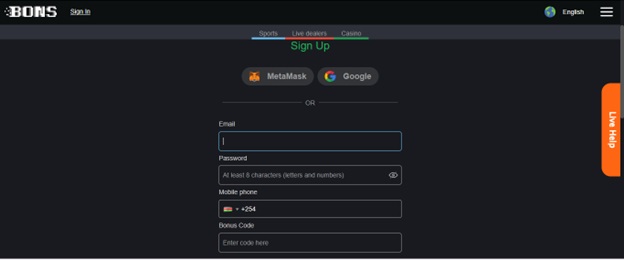 Visit the Bons Casino website and click signup. You will be asked to give your email, password, mobile phone, and promo code to help you enjoy the welcome bonus. Fill these up then click signup.