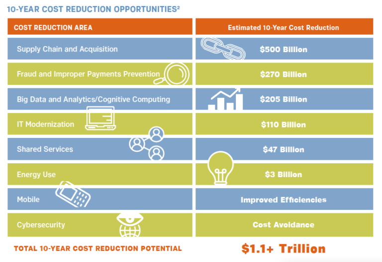 The cost savings proposal drafted by the Technology CEO Council, a think tank of IT chieftains, is expected to save U.S. government $1.1 trillion over ten years, if adopted. This is how the cost saving is broken down.