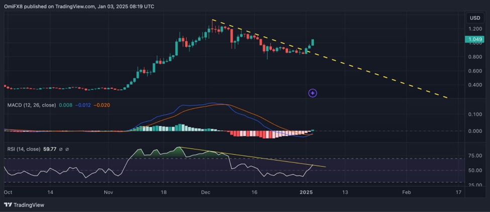 This week, Cardano’s price surged nearly 25%, bouncing back above $1. This allowed the token to jump above a descending trendline it has been trading under since hitting a new yearly high in early December.