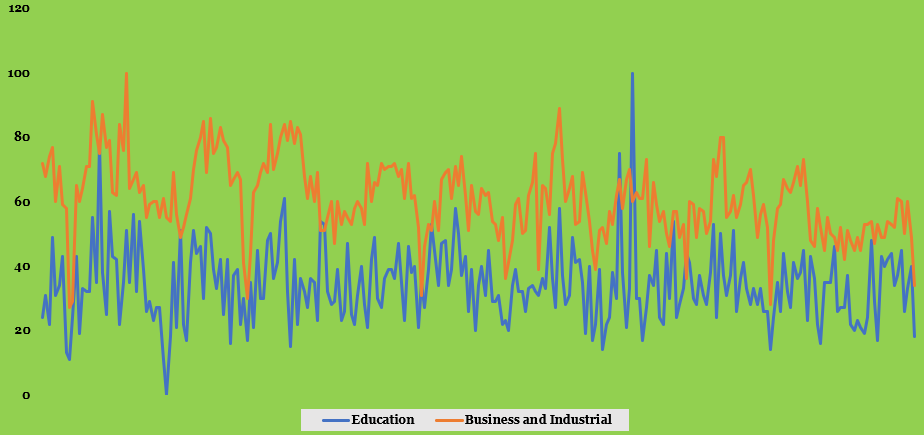In our experience, we have realised that people across the world developed a significant interest in knowing brands within case studies [see Exhibit 1 and Exhibit 2]. We found a 34% stronger connection in global interest in discerning case studies within industries, and education sector. On average, people interest in case studies within industries has been 34%, while it remains 60% as at the time of writing this insight. From marketing to leadership strategies, public want to learn from successful and unsuccessful businesses [see Exhibit 2].