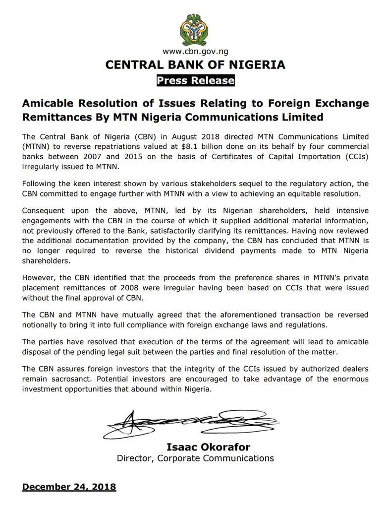 The Central Bank of Nigeria has reached a truce with MTN on the alleged illegal repatriation of funds from Nigeria.