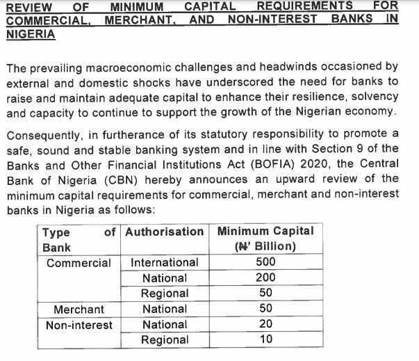 Here’s the breakdown of the new capital requirement set by the Central Bank of Nigeria (CBN):