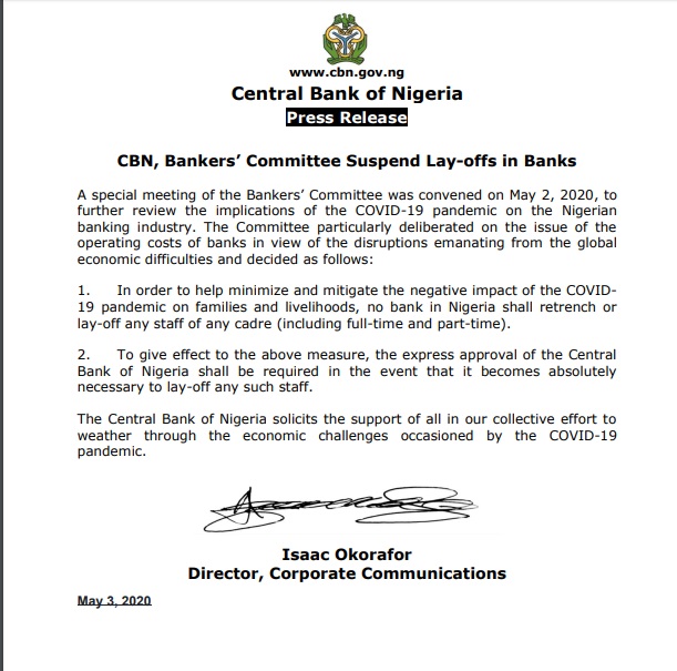 “1. In order to help minimize and mitigate the negative impact of the COVID- 19 pandemic on families and livelihoods, no bank in Nigeria shall retrench or lay-off any staff of any cadre (including full-time and part-time).