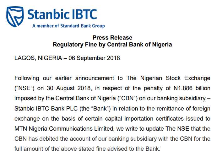 Following our earlier announcement to The Nigerian Stock Exchange (“NSE”) on 30 August 2018, in respect of the penalty of N1.886 billion imposed by the Central Bank of Nigeria (“CBN”) on our banking subsidiary – Stanbic IBTC Bank PLC (the “Bank”) in relation to the remittance of foreign exchange on the basis of certain capital importation certificates issued to MTN Nigeria Communications Limited, we write to update The NSE that the CBN has debited the account of our banking subsidiary with the CBN for the full amount of the above stated fine advised to the Bank.