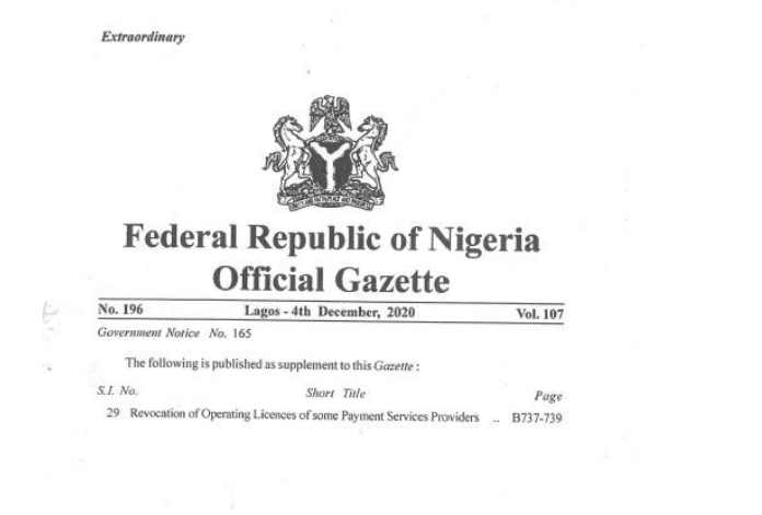 The Central Bank of Nigeria (CBN) has revoked the operating licenses of 7 payment service providers and one switch service provider. These entities have failed to meet their statutory obligations, according to a Federal Republic of Nigeria Gazette.