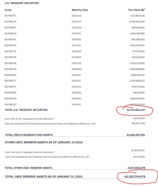 Circle holds 77% of their reserves in 1-4 month T-Bills. These T-Bills are held at BNY Mellon and managed by Blackrock. This provides an absolute floor on USDC of 0.77.