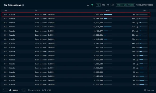 According to data from blockchain analysis firm Nansen, the biggest burn, a record in the USDC burn, was when $723.5 million was sent to an empty address and burned.