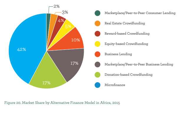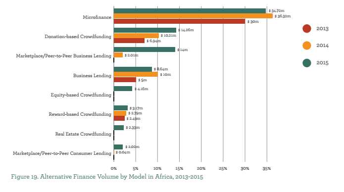In Africa, the market was nearly $190 million between 2013-2015, and grew 36% in 2015 to $83 million. Most African activity was through online microfinance as well as donation and rewards-based crowdfunding. Investment-based equity and debt models are yet to really make their mark on the African market.