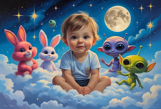 A forgotten childhood memory of an imaginary friend, half-wizard and half-panda, with a mismatched crown and raincoat constructed from stars, waving goodbye to a child through a misty window.”