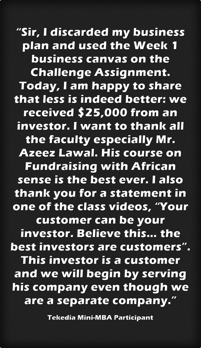 “Sir, I discarded my business plan and used the Week 1 business canvas on the Challenge Assignment. Today, I am happy to share that less is indeed better: we received $25,000 from an investor. I want to thank all the faculty especially Mr. Azeez Lawal. His course on Fundraising with African sense is the best ever. I also thank you for a statement in one of the class videos, “Your customer can be your investor. Believe this… the best investors are customers”. This investor is a customer and we will begin by serving his company even though we are a separate company.” from a Tekedia Mini-MBA participant.