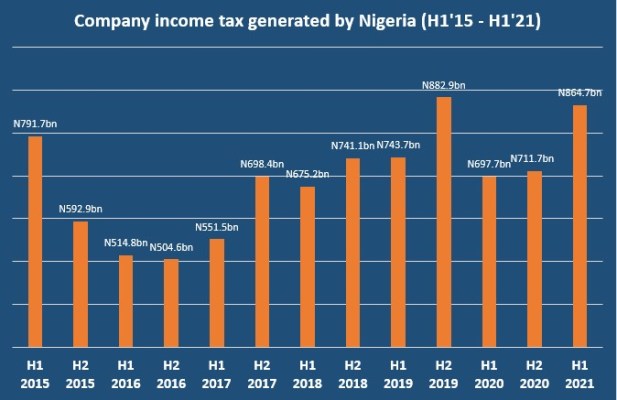 Corporate tax collection in Nigeria continues to improve: “The Nigerian government through the Federal Inland Revenue Service (FIRS) generated the sum of N864.72 billion as company income taxes in the first half of the year (H1 2021), representing a 57.8% achievement rate compared to the annual CIT projected revenue of N1.49 trillion. This is contained in the recently released company income tax report, by the National Bureau of Statistics (NBS).”