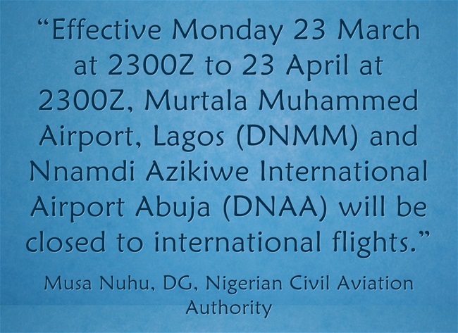 “Effective Monday 23 March at 2300Z to 23 April at 2300z, Murtala Muhammed Airport, Lagos (DNMM) and Nnamdi Azikiwe International Airport Abuja (DNAA) will be closed to international flights,” Nigerian Civil Aviation Authority Director-General, Musa Nuhu.
