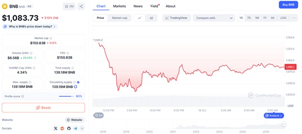 | BNB (Binance Coin) | $1086.49 | $158.3B | -5.74% | Testing $1,000 support |
