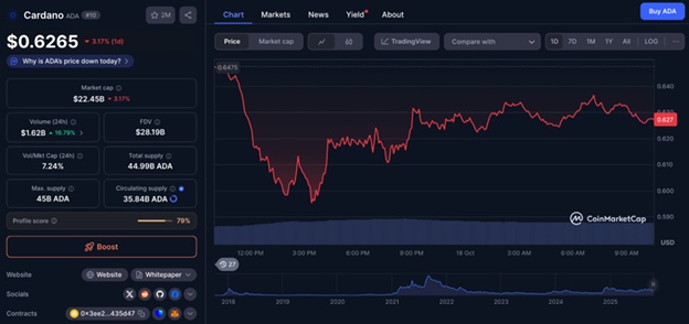 Cardano (ADA) trades at $0.626 with a market cap of $22.3B. Oversold RSI levels suggest potential reversal toward $0.80 in Q4. With new DeFi partnerships forming, Cardano retains its appeal as one of the best crypto coins, integrating smart contract interoperability and long-term scalability.