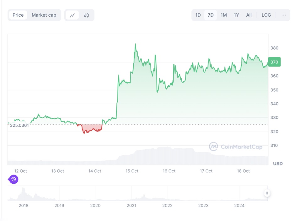 Additionally, Bitcoin Cash token has surged in value recording a nearly 18% monthly rise and over 13% weekly gain. Currently, BCH price has tested a weekly high of $376, after fighting to price back up from its $323 resistance level as seen in the chart below.