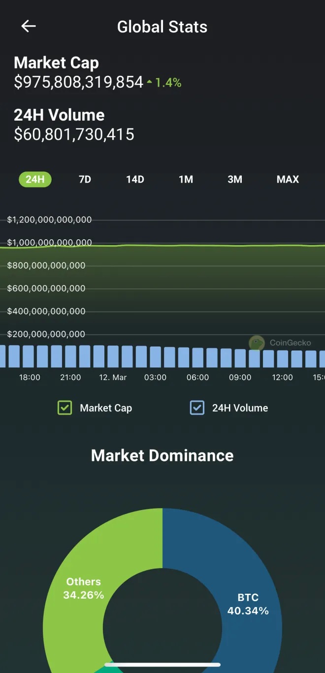 The market cap has undergone a downturn since exceeding the $1.04 trillion resistance level on February 21st, breaking below the $945 billion support level on March 9th.
