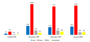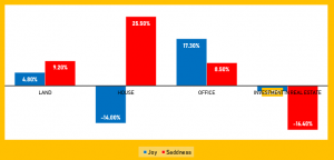 In October, 2019, analysis shows that the reflection of happiness in the messages connected with the buyers and investors’ interest in lands, houses, renting offices and investing in real estate products by 41.8%, while it only facilitated their interest in the products by 17.5%. In November, 2019, the linkage and facilitation reduced to 39.4% and 15.5% respectively. A surge in the connection and causation was found in December, 2019. During the month, the dominant emotions ensured 40.2% linkage with the interest in the products and 16.1% facilitation in them. From January 1 to January 25, 2020, the dominant emotions ensured 45.8% connection and 21% facilitation.