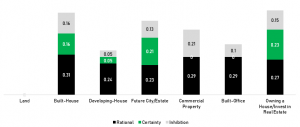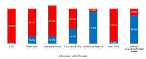 Sieving through the data, we discovered that the marketers were more rational in promoting built houses, offices, commercial property and owning a house or invest in real estate products. Despite being more rational while promoting owning a house or invest in real estate products, our analysis reveals that the level of certainty was better than what was found for future cities or estate promotion (21%). One of the surprising results is the low level of certainty discovered for the promotion of abilities and capabilities of constructing houses, and high level of inhibition found for commercial property marketing [see Exhibit 4].