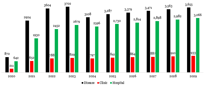 Looking ahead, projections suggest that health searches will continue to grow, but at a more stable and modest pace. Between 2025 and 2029, searches for diseases are expected to rise gradually from 3,287 to 3,655. Clinic searches are projected to move from 841 to 933, while hospital searches will grow from 2,730 to 3,066. These increases amount to roughly two to three percent growth per year.