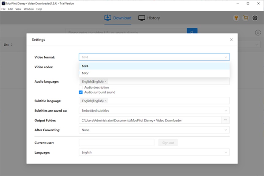 Click on the Download icon to start downloading movies from Disney Plus to MP4/MKV with the original subtitles and audio. You can check your downloads in the History tab.
